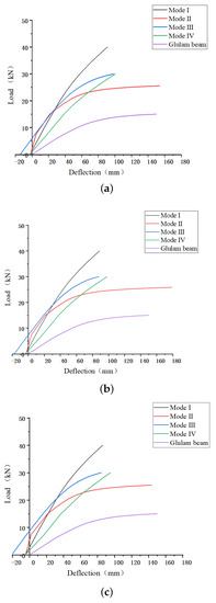 On the other hand, the prestressed beam with a mode III anchorage device is easily influenced by the increase of the prestress, and its bending performance and stiffness get the most noticeable improvement. Initially, the stiffness of the prestressed beam with mode IV was the lowest, but when the deformation of the Glulam beam is relatively large, the beam would be in contact with the reinforcement. Therefore, the ability of collaborative work would be improved in the later stage, which will not result in a significant reduction in its stiffness.