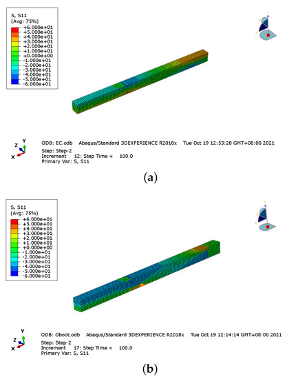 The bending stress distributions of Glulam beams with 30 kN load are shown in Figure 11. There are the bending stress distribution figures of half-span Glulam beams because of the symmetry. Figure 11a shows the stress distribution of the prestressed beam with mode I anchorage device. Between the two loading points, the stress distribution is uniform. Meanwhile, the stress value is not high, and there is no stress concentration in the whole beam. Figure 11b shows the bending stress distribution of the boot anchorage prestressed beam. The stress distribution between the loading point and midspan is uniform. However, the compression stress between the bending section is higher than in other areas. However, the highest stress is found near the bolt anchorage because of the bolt effect, which causes the stress concentration and stiffness to decline. The compression stress of the prestressed beam with mode III anchorage device between the bending section is uniform, as shown in Figure 11c, but the stress was much high. Figure 11d presents the bending stress distribution of the slotted anchorage prestressed beam. The bending stress near the mid-span is not high. However, as expected, the bending stress near the notch area is very high due to stress concentration caused by the notch.