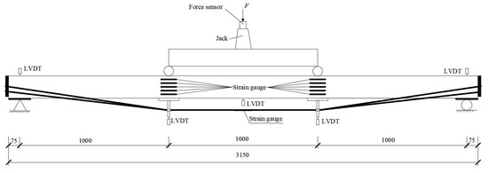 A Four-point bending test was adopted by the Chinese national standards [32,34]. The photo and schematic diagram of the bending test are shown in Figure 12 and Figure 13. Based on a related study [35], the distance between two supports was 3000 mm, and a shear span ( distance from the support reaction force to the nearest applied concentrated load) was 1000 mm. A linear variable displacement transducer (LVDT) with a range of 50 mm was attached to the top side of each specimen at support points to measure the deflections. Two LVDTs and one LVDT with a range of 150 mm were attached to the bottom side of each beam at two loading points and the mid-span point to obtain corresponding vertical deflections, respectively. Five strain gauges were bonded to the loading-point lateral surface with equal spacing to get the strain located at the loading point. Meanwhile, the strain situated at the top and bottom of the half-span beam was gauged by the two 100 mm × 3 mm strain gauges separately. The 2 mm × 3 mm strain gauges were pasted to the steel wire surfaces at an L/2 distance from the beams’ support points.