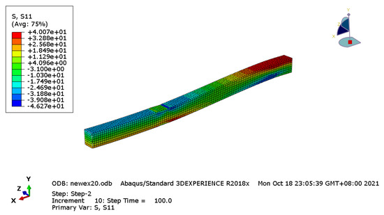 Three-dimensional finite element models were developed to simulate the prestressing state and the loading state after applying the prestress of the prestressed Glulam beams. The Glulam beam was 3150 mm in length, 150 mm in depth, 100 mm in width, and 3000 mm in span length. The mesh size was 20 mm, except for the steel bars, the mesh property of other parts was C3D8R, the steel bars’ mesh property was B31, its size was 50 mm. At the final stage, the flexural tests of prestressed Glulam beams were simulated, following modeling of the prestressing process and then the loading process.