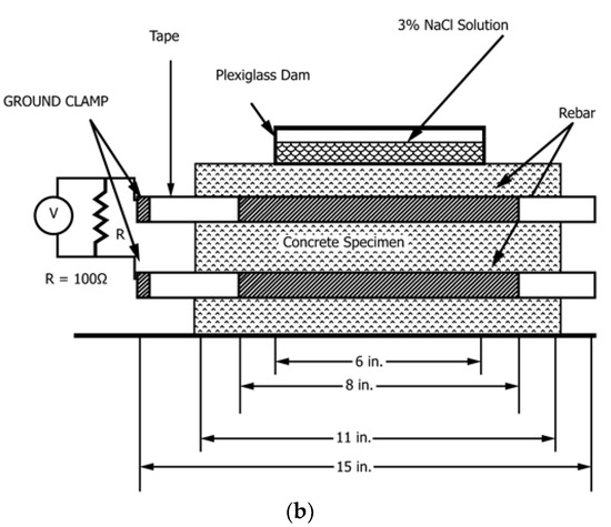 When the concrete beams are exposed to chloride ions and high moisture content, their resistivity can decrease, making it possible for anodes and cathodes to be separated [47]. Hence, the type of corrosion observed is typically macro-cell corrosion where top reinforcement acts as anode while two bottom rebars act as cathode in this case. The potential difference between the anode and cathode causes current flow and corrosion. This corrosion mechanism was mimicked with properly designed samples containing two layers of reinforcement that were electrically connected through a resistor (R = 100 Ohm). The corrosion current flowing between the reinforcement layers was determined by measuring the voltage drop over the resistor. Testing of each sample was continued until 48 weeks even though standard mentions that testing can be terminated when the average integrated current over time is 150 coulombs or greater. The ASTM G109 standard [35] also notes that the time to failure is typically six months, which has been investigated here as well.