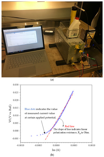 At different times of exposure, Corrosion Rate (CR), was determined using the electrochemical method, Linear Polarization Resistance (LPR), described in ASTM G 59 [48] and G 102 [49]. LPR is a reliable, nondestructive technique for corrosion measurements [50]. In this technique, the reinforcing steel is polarized by a small amount of potential from its equilibrium potential either potentiostatically or galvanostatically [51]. In this study, the steel reinforcing was polarized potentiostatically by changing its potential with a fixed amount, ΔE, and recording the corresponding current, ΔI, for a fixed duration of 240 s. Since the change in potential, ΔE, is recommended to be in the range of 10–30 mV for obtaining a linear polarization curve [52], an initial potential of 15 mV below the corrosion potential, Ecorr, is ramped to a final potential of 15 mV above Ecorr at a rate of 0.125 mV/s. The LPR setup that was used for measuring corrosion current is shown in Figure 3. The linear polarization resistance, Rp in Ohm, was determined from the slope of the linear curve obtained by plotting the applied potential (E) vs. current density (i) at i = 0 (Figure 3b) [48].