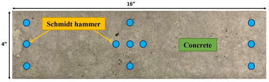 At 21 days from casting—the minimum age requirement to cure the samples in accordance to ASTM C666 [36], three cylindrical specimens (Φ100 × 200 mm) from each mixture were tested in saturated surface dry (SSD) condition, following the procedure reported in ASTM C39 [44] in order to determine each mixture’s base compressive strength before exposure. After every 30 cycles (about 3–4 days), a non-destructive compressive strength test was performed using a Schmidt hammer to assess the strength of beams exposed to freeze/thawing cycles, taking eleven measurements on each face of the concrete beams in accordance with ASTM C805 [56] (Figure 4). Because the Proceq Schmidt hammer was utilized in a vertical downward position, the readings were rectified according to the chart in the Proceq Schmidt hammer manual. For each concrete beam, the mean rebound hammer value is measured and converted to compressive strength.
