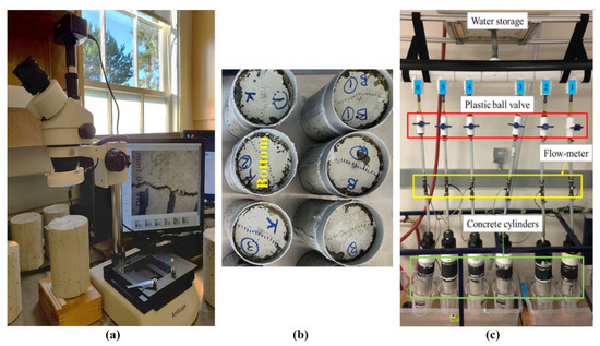 (a) Crack investigation using optical microscope. (b) Cylinders prepared for testing (bottom side exposed to water flowing from tank). (c) Self-sealing setup [58].