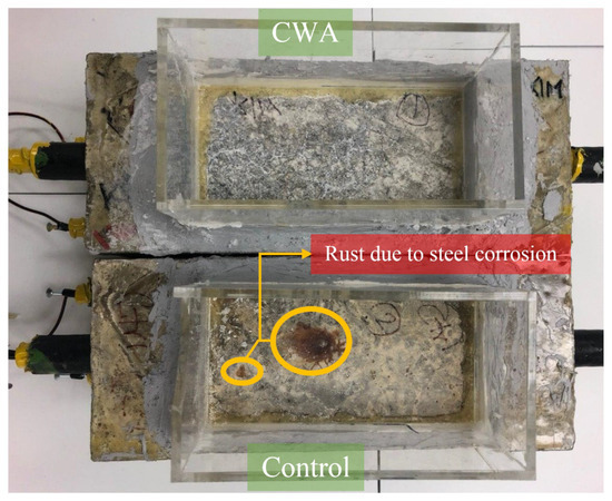 Visual inspection of corrosion in control and CWA-modified concrete beams.