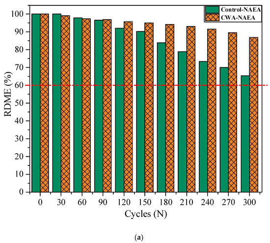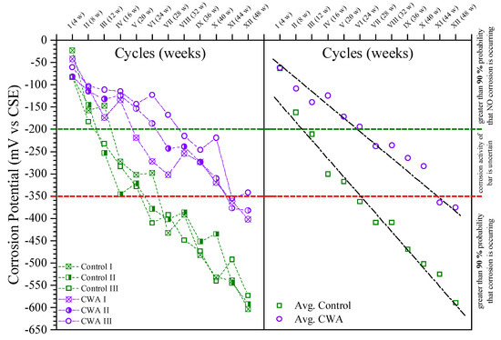 Potential reading is related to the thermodynamics of the corrosion process and determines the probability of corrosion occurring in a particular environment, but cannot evaluate the kinetics of the reaction [59]. Potential measurements for each top rebar (anode) subjected to sodium chloride were conducted in compliance with ASTM C876 [34] using a copper–copper sulfate electrode. The potential variation of the rebar was monitored continuously every 4 weeks over a period of 48 weeks (Figure 7). For control and CWA mixes, the figure represents both individual and average corrosion potential. CWA mix indicates a less than 10% probability of no corrosion for the first 24 weeks. Control concrete, on the other hand, had a greater than 90% probability of not corroding within the first 8 weeks. The addition of CWA to concrete slowed the corrosion of reinforcing. According to Table 3 taken from ASTM C876 [34], a potential drop to −350 mVCSE or lower indicates that there is a greater than 90% probability of corrosion risk for reinforcing steel embedded in concrete. While active corrosion took place for the control beams after 28 weeks of exposure, the corrosion initiation for CWA-treated samples happened after 48 weeks of exposure. This could be due to either a reduction in solution permeability into the concrete matrix (due to the presence of CWA crystals) or a progressive restriction in the supply of oxygen to the surface of the embedded reinforcing steel (due to void reduction and interconnectivity of pores for oxygen molecules transfer), or a combination of the two [60].