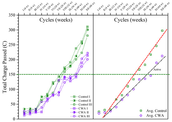 As per ASTM G109 [35], the total charge passed through the resistor between the two layers of reinforcement was monitored for both sample types, and samples were identified as being active when a total charge of 150 Coulombs or more passed through the resistor, as illustrated in Figure 8. The total charge passed for each sample in 48 weeks is presented on the left side of the graph, while the average value for each mix is shown on the right side. The macrocell current and hence the total charge travelling through the samples at the start of the test are very low, as seen in Figure 8. When the total charge going through the resistor exceeds 150 Coulombs, both begin to increase at the point of activation. The average active corrosion status (above 150 Coulombs) for control samples occurred at 32 weeks of exposure, whereas this active stage was on the 44th week for beams with CWA additive, indicating admixture effect on delaying corrosion onset. After 48 weeks of exposure to sodium chloride solution, the testing was completed. The data analysis revealed that the control mix had a higher rate of macro-cell corrosion than the CWA mix after the testing was completed.