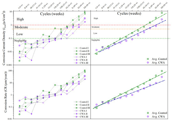 The measured values of corrosion current densities (icorr) and corrosion rate (CR) using LPR method at different time intervals of the exposure period are illustrated in Figure 9. Based on the criteria for the state of corrosion of steel in concrete, as shown in Figure 9, it is observed that control mixes were in the state of moderate to high corrosion on the 32nd week, while this occurred to CWA mixes on the 40th week. As the icorr for control samples far exceeded the passive limit of 0.1 µA/cm2 at an earlier stage, this indicates the lower corrosion rate for concrete beams treated with CWA due to less available space and impermeable environment for ions’ movement. A variety of factors influence the measured icorr values, such as localized pitting corrosion, testing and physical conditions, which cause fluctuations in the CR values over time [51]. Considering the results of untreated samples, it can be confirmed that the addition of CWA to the mixtures certainly reduces the rate of corrosion, as it provides lower porosity and pore interconnection, resulting in blocking ions pathway from anodic to cathodic site. Considering both control and CWA mixes, it was not possible to pick up the exact time of corrosion initiation from LPR technique (this is the testing technique limitation); hence, it is difficult to point out which one of the two mixes would have longer initiation period under the simulated harsh test conditions. Although corrosion initiation time cannot be precisely determined with LPR, but the results indicate that the presence of CWA in the mix delays the initiation. LPR technique is greatly useful to estimate the rate of corrosion. While Figure 9—left side shows each sample’s corrosion rate and current density over the course of 48 weeks, Figure 9—right side illustrates that the slope of the line passing through average values of corrosion current density and CR, is greater for control samples, representing slower corrosion rate in CWA-treated specimens.