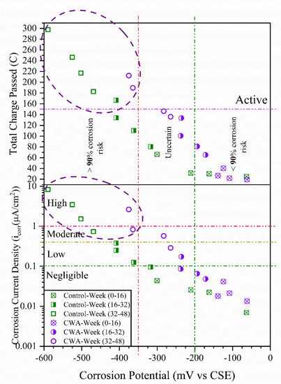 Gamry Reference 600+ measures the HCP, and presents it as corrosion potential, Ecorr. Generally, the more negative the Ecorr, the higher the icorr, although large scattering of data occurs (Figure 10). Categorized by Broomfield [61] as boundary value for the low-to-moderate corrosion rate measured by using confined current technique, icorr was approximately 0.1 µA/cm2 at an Ecorr of about −300 mV. The reinforcement corrosion activity in the current study largely supported this hypothesis (Figure 10). For both untreated and CWA-treated beams, Figure 10 illustrates an approximately linear relationship between the logarithm of corrosion current density, macrocell corrosion, and the corrosion potential. Considering all corrosion testing results being used in this study, divided in three-time steps (0–16, 16–32, and 32–48 weeks), the higher corrosion probability and rate (about 30% higher) was observed for control specimens within 32–48 weeks of exposure when compared with CWA-modified mixes. This has been circled in Figure 10 where total charge passed is above 150 C, the corrosion potential is lower than −350 mV and icorr is greater than 1 µA/cm2. As can be seen, most of points within high corrosion risk belong to control samples and it can be stated that CWA mixes did not show signs of severe corrosion within the testing period (48 weeks), indicating its influence on delaying/avoiding corrosion in reinforcement.