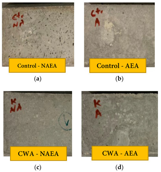 Surface of concrete samples exposed to 300 freeze/thaw cycles: (a) Control—NAEA; (b) Control—AEA; (c) CWA—NAEA; (d) CWA—AEA.