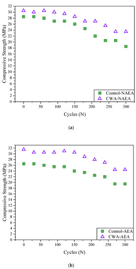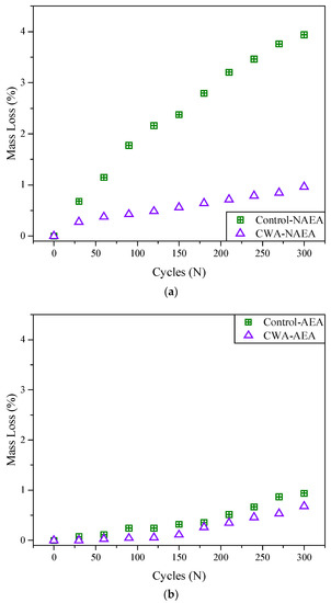 When exposed to freeze–thaw cycles, greater mass loss and lower durability factors were obtained for mixes without CWA and Air-Entraining Admixtures (AEA). Using resonance frequency testing for performance evaluation, the presence of CWA even in non-air-entrained concrete showed higher dynamic modulus of elasticity value and significant resistance to freeze–thawing cycles.