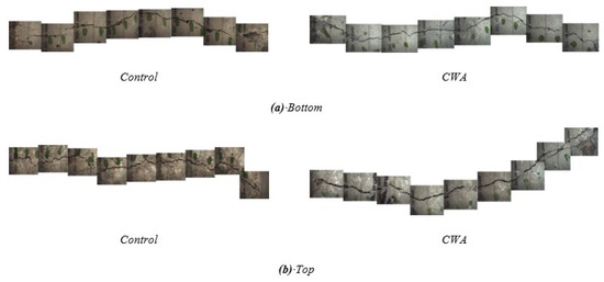 The surface crack width (mm), measured initial flow, percent flow-reduction rate, and Sealing Ratio (SR) , were quantified and determined as summarized in Table 6. The average crack width of three cylinders is about 0.36 mm, being very similar between two mixtures. Water flow is also considerably reduced in control samples (86–92 percent), but it is entirely stopped and reached a 100 percent flow reduction in CWA-treated samples after around 25 days of testing. Similar results were obtained for SR values, indicating better performance of CWA mix in this regard. It is concluded that even though the surface crack width was very similar for both mixes, but it did not truly represent the sealing capability between the mixes since the higher flow reduction, complete water stop, and higher sealing ratio were obtained for CWA samples. This can be mainly due to formation of additional pore-blocking crystals through crack, resulting in blocking water pathway and closing crack path.