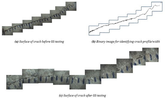 After air curing, each sample was placed in a Standard Crack-Inducing Jig (SCIJ) [57] to induce a crack width ranging from 0.1 to 0.6 mm using Universal Testing Machine, MTS Systems, Eden Prairie, MN, USA. Surface crack width for each cylinder (top and bottom sides) was measured by optical crack-detection microscope of AmScope, United Scope LLC., Irvine, CA, USA, at equidistant points along the crack (Figure 5a). The images from crack surface were further analyzed with ImageJ software, ver. 1.531, 2021, National Institutes of Health, Rockville Pike, Bethesda, MD, USA, to determine crack profile/size/width. The measurements were then averaged and recorded as the cylinder average. The cracked specimens were later inserted into single-use molds, special rubber sleeves, sealed using silicon sealant (Figure 5b); then one end of cylinder sample, mold-finished side of cylinder (called bottom), was exposed to a constant water head (~1.7 m). The flow of water through specimens was collected from the top surface of cylinder during casting and measured over a period manually. The water flow through a cracked sample was measured until no leakage or water dripping from it was not observed. Details of the self-sealing test setup are illustrated in Figure 5.