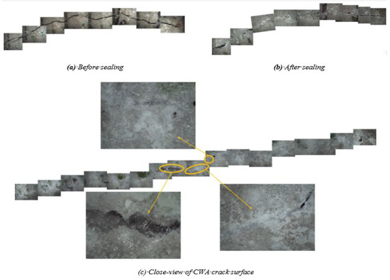 Crack surface of CWA specimen. (a) Before sealing; (b) after sealing; (c) close view of crack surface.