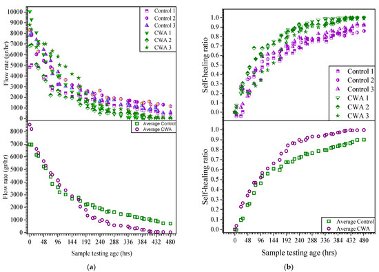 The results of flow rate and self-sealing ratio for all samples and their average values are illustrated in Figure 18. The initial water flow through samples was 6.500–10.050 mL/h for CWA-treated samples while this value was within 4.800 to 8.400 mL/h for control cylinders. Although the average crack width for both specimens is very similar but the initial flow rate is higher for CWA specimens. This confirms that equivalent crack sizes of CWA samples, proposed in [32], are greater than control mixes while their actual crack width is the same. In other words, two samples with the same surface crack width do not necessarily have the same water flow rate. One can observe that the cracked cylinders experienced a rapid initial flow during the first 100 h and reached to flow rate below 3000 mL/h, whereas the water flow reached to different reduction rate and a steady state after 300 h. Overall, the water flow through the samples reduced over time, indicating “self-sealing” of concrete.