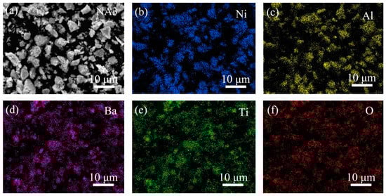Morphology of mixed powders by ball milling: (a) SEM morphology; (b) Ni; (c) Al; (d) Ba; (e) Ti; (f) O.