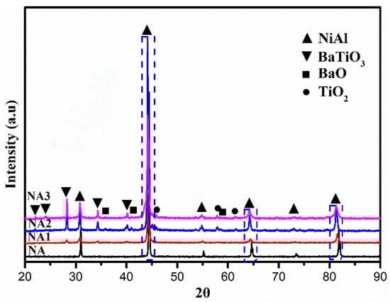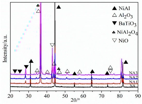 Figure 1 shows the powders’ morphologies and element distribution after mixing, which presented with a uniform distribution and have average particle sizes. Besides this, according to the positional overlap of elements Ba and Ti, the TiO2 and BaO oxides combined very well. Figure 2 presents the XRD patterns of the composites after sintering. NiAl–BaO/TiO2 composites all contained strong NiAl peaks mainly. Meanwhile, except for the presence of intermetallic NiAl, there were also some peaks of BaO, TiO2 and BaTiO3 in NA1, NA2 and NA3. The existence of BaTiO3 peaks indicated that BaO and TiO2 reacted with each other at sintering temperatures of 1300 °C, and its intensity increased with the increased content of reinforcing phases. With the increasing of oxides content, NiAl peaks shifted to the left accordingly, which is probably due to the oxide elements dissolving in the NiAl matrix during sintering, making the interplanar spacing expand and then improving the mechanical properties [22].