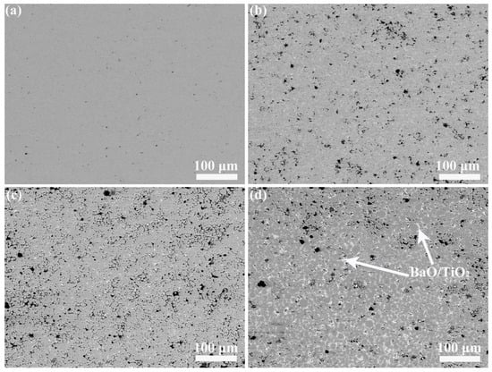 Figure 3 presents the sintered microscopic morphologies of the composites. The NA had a dense microstructure (Figure 3a). The microscopic morphologies of the composites involved some white phases with the addition of BaO and TiO2, which were almost evenly distributed in the NiAl grain boundaries. Meanwhile, these white phases gradually increased with the increased content of BaO and TiO2. Although a few pores (black areas) appeared in the matrix materials, overall, the composite still exhibited a very good sintered compactness.
