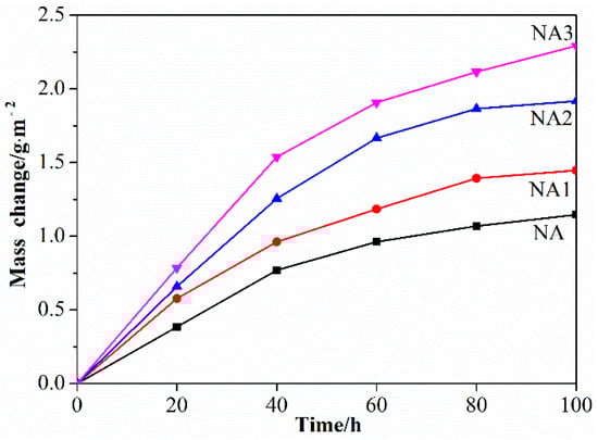 In the initial stages of oxidation, the rate of oxidative weight gain of each sample was relatively fast. During this time period, Al2O3 gradually nucleated, growing at higher energy levels on the surface where exposed to air, especially at defects such as pores and phase boundaries. In these samples, because of good sintering compactness proven by the small number of pores (Figure 3), surface defects were mainly the effects of phase boundaries. These defects led to faster oxidation weight gain at early stages, which is consistent with the trend of morphologies after sintering. This process continued with the extension of the constant temperature holding time. Meanwhile, the growth of a nucleated aluminum oxide nucleus as described above began to become the main factor affecting oxidative weight gain, until the oxide film almost covered the whole surface as well as some interfaces. During this period, the concentration gradient of Ni caused by Al depletion would make Ni diffuse inward [30]. In the late stage of oxidation, the oxidation rate drops comparatively, due to Al outward diffusion and O inward diffusion determining the process rate [33,36]. Besides this, the diffusion of elements at the phase boundaries is faster than diffusion within the crystal, which also explains why the oxidation rate of NA3 is still much larger than others [33,36].