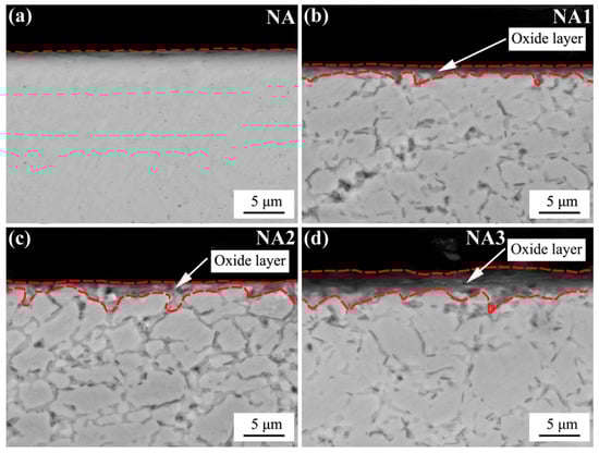 To further investigate the oxidation performance of the composites, their cross-sectional morphologies were observed. Figure 7 shows cross-sectional morphologies of four composites after oxidation. After 100 h oxidation at 800 °C, the NA showed almost no obvious oxide layer, which shows that the oxidation resistance of NiAl was excellent. This result is also consistent with the oxidation weight gain curves of the composites (Figure 4). The thickness of the oxide film increased with the addition of BaO/TiO2. Meanwhile, increases in BaO/TiO2 led to the thickness of the oxide films to gradually increase. The NA3 had the thickest oxide film. It can be concluded that the NA had the best oxidation resistance and the NA3 had the worst oxidation resistance. These results are very consistent with the isothermal oxidation kinetics curves in Figure 4. The thickness of all the oxide films was less than 5 μm. It can be concluded that all composites had a good oxidation resistance performance at 800 °C.