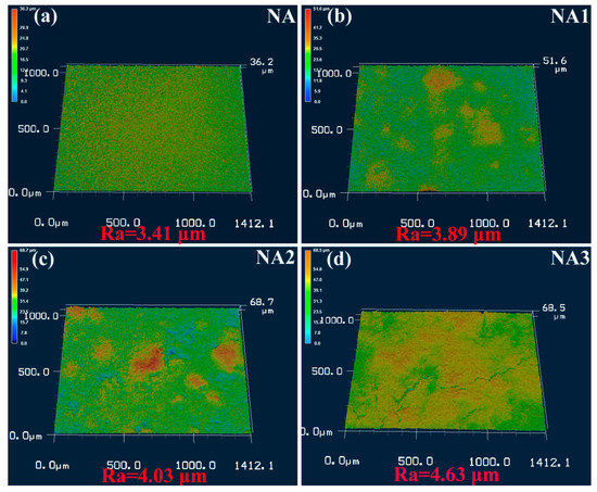 3D laser scanning confocal microscope topography of the composites after oxidation for 100 h at 800 °C: (a) NA; (b) NA1; (c) NA2; (d) NA3.