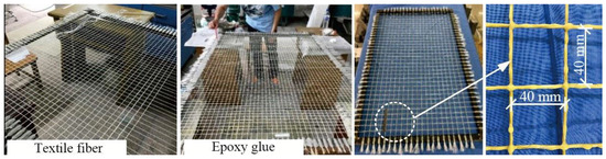 Alkali-resistant glass fiber was selected with the knitting method of plain weave to make the textile, as shown in Figure 1. The glass fiber has low cost and its alkali resistance is greatly improved due to the existence of zirconia (ZrO2) [27,28,29]. Therefore, the glass fiber used in this study can effectively resist the corrosion of high alkaline substances in cement. The surface of fiber bundle was impregnated with epoxy resin adhesive, i.e., type CFSR-A/B impregnating adhesive produced by Carbon Technology Group Co., Ltd. The tensile strength of the epoxy resin is 57 MPa and the modulus of elasticity is 2.586GPa. The ratio of curing agent to diluent was set to 5:1 to improve the synergistic capacity of the fiber bundle and concrete matrix [30]. In the process of epoxy resin coating, the adhesive was impregnated between the roving inside the fiber bundle to completely bond the roving. The synergistic capacity of the fiber bundle and concrete matrix was improved after curing of the epoxy resin. The mechanical material performance of the glass fiber used in this study was tested in the Mechanics of Material Laboratory of Jilin University and the mechanical properties and geometric parameters of the alkali-resistant glass fiber are shown in Table 2 [31].