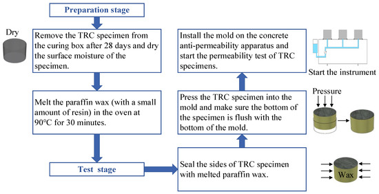 The permeability of concrete to liquid and gas is an important physical property of concrete, which is closely related to the durability of concrete [1]. The permeability mainly depends on the pore structure [2,3] inside the matrix, and the durability of the structure repaired with textile-reinforced concrete (TRC) that can resist liquids and gases [4]. TRC is a new type of cement-based composite material consisting of multidimensional fiber bundles and concrete matrix [5,6]. Compared to reinforcement steel, textile fiber has the advantages of high corrosion resistance [7,8,9] and light weight [10]. Moreover, TRC can effectively resist the effects of chloride ions and carbon dioxide in the environment due to the presence of high corrosion resistance of the fiber materials [11] (such as carbon fiber, alkali-resistant glass fiber, basalt fiber).