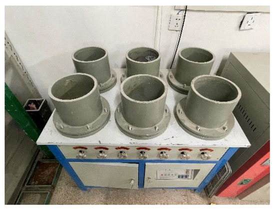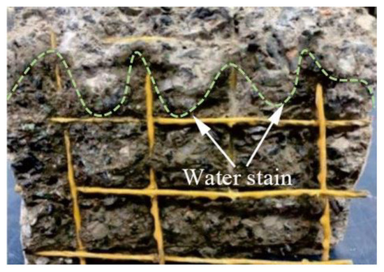 The method of the TRC permeability test is shown in Figure 4 and the concrete anti-permeability apparatus is shown in Figure 5. The TRC specimens were 28 days of age and the water pressure of the permeability test was set to 0.5 MPa for 24 h. After the permeability test, the TRC specimens were split along the interface arranged by the textile in the TRC. Then, obvious water stains could be seen on the section, which represent the water seepage height, as shown in Figure 6. By comparing the water seepage height of each group of specimens, it was found that the water seepage height of specimens increased with the Tex content and water–cement ratio but decreased with the fiber grid size.