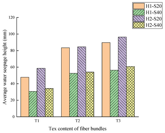 The relative permeability coefficient and the average water seepage height of the TRC specimens under different research factors are summarized in Table 5 and Figure 7. According to the result of the TRC permeability test, the migration pattern of water in TRC can be described as the permeability of TRC increasing with the increase of Tex content and water–cement ratio but decreasing with the increase of fiber grid size.