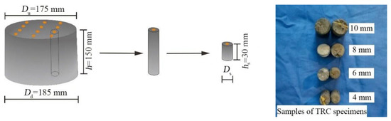 The specimens were carefully observed and sampled for NMR scanning after the permeability test. A circular truncated cone specimen was sampled randomly, as shown in Figure 8. The NMR samples were 4, 5, 6, 7, 8, 9, and 10 mm in diameter and 30 mm in height. To ensure the accuracy of the experimental data, there were three pieces of NMR samples of each size, and all samples were taken from the same TRC specimen. The pore parameters of the samples were measured and averaged with NMR apparatus (Suzhou Niumag Analytical Instrument Corporation, Suzhou, China) after sampling.