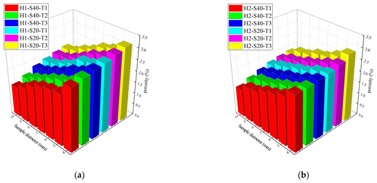 Nuclear magnetic resonance (NMR) relaxometry can carry out the detection of the porous structure in a completely nonperturbative manner [32,33]. Thus, NMR tests were conducted on the samples subjected to permeability tests for determining the pore characteristics of different fiber mesh spacings and different fiber contents in TRC. Before the NMR test, the specimens were placed in a vacuum saturation device for 24 h to make them reach the saturation state. Carr–Purcell–Meiboom–Gill pulse sequence was used to collect and calculate the NMR data. The calculation method is represented as Equation (4) [34].