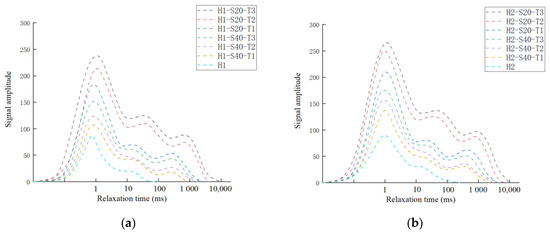 where is the transverse surface relaxation strength of the porous medium, μm/ms, which is related to the sample types; is the pore surface area; and is the pore volume. The value of is related to the pore size and the distribution of spectrum indicates the distribution of the pores.