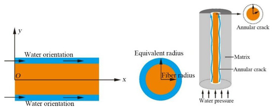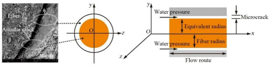 In the TRC, microcracks are found on the interface between the fiber bundles and the concrete matrix. Therefore, the pressurized water migrated in the microcracks along the fiber bundle. The microcracks around this fiber bundle can be expressed as the concentric circular slit, as shown in Figure 14.