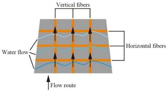 An equivalent seepage resistance method was adopted to study the migration law of water pressure in TRC. Specifically, the hydroelectric similarity principle was used to describe the seepage field with circuit diagram, and then the circuit law was applied to solve the seepage law. In TRC masses, the main fracture system was composed of a finite number of single fractures. Only two basic combinations (series and parallel) were found between each single crack. The layout of the fiber in the TRC created a mutually perpendicular joint crack in TRC (Figure 15). Thus, the main factor of the permeability of the TRC depends on the joint cracks.
