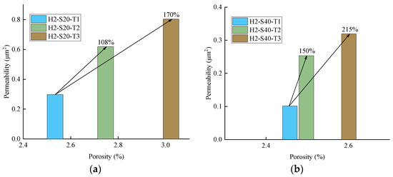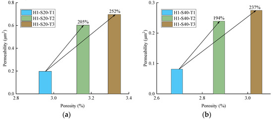 Relationship between the permeability and porosity of TRC (H2); (a) Grid size 20 mm × 20 mm; (b) Grid size 40 mm × 40 mm.
