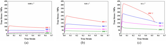 The flow behavior of the TC31 titanium alloy at different strain rates: (a) 0.001 s−1; (b) 0.01 s−1; (c) 0.1 s−1.