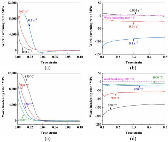 Work hardening rate at different deformation conditions: (a,b) 950 °C; (c,d) 0.01 s−1; ((a,c) are lower strain conditions; (b,d) are relatively higher strain conditions).