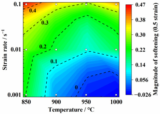 where σp is the peak stress and σ0.5 is the flow stress at the strain of 0.5. The hot deformation conditions had a significant effect on the flow softening coefficient of the TC31 titanium alloy as shown in Figure 6. The dynamic softening occurred in the region of higher strain rates (0.01 s−1 to 0.1 s−1) and the flow softening became more severe with the decrease in the deformation temperature. The values of the flow softening coefficients decreased with the decreasing strain rate and the increasing deformation temperature. Specifically, the values of the flow softening coefficients changed into negative values when the deformation temperature was 950 °C~1000 °C and the strain rate was 0.001 s−1, which indicated the occurrence of dynamic hardening, but the minimum value was only −0.026 and the degree of dynamic hardening was relatively slight.