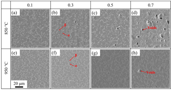 When the deformation temperature increased from 850 °C to 950 °C, the volume fraction of the β phase increased from 20% to 41% at the strain of 0.7 and the size of the β phase also had a significant coarsening. It is well known that the sliding resistance of the α/β phase interface is lower than that of the α/α interface and the β/β interface [40,41]. Therefore, the increase in the proportion of the α/β phase interface which is attributed to the rise of the volume fraction of β phase is beneficial to grain boundary sliding, and the deformation consistency is also improved simultaneously [22,24,41]. At the same time, the recovery and recrystallization at 950 °C was more efficient than those at 850 °C, which led to a lower dislocation density near the phase and grain boundaries [18,39,40]. Hence, the volume fraction of the voids was less than 1% when the deformation temperature was 950 °C and the strain was 0.7, and the flow stress was almost steady during the deformation, as shown in Figure 3b.