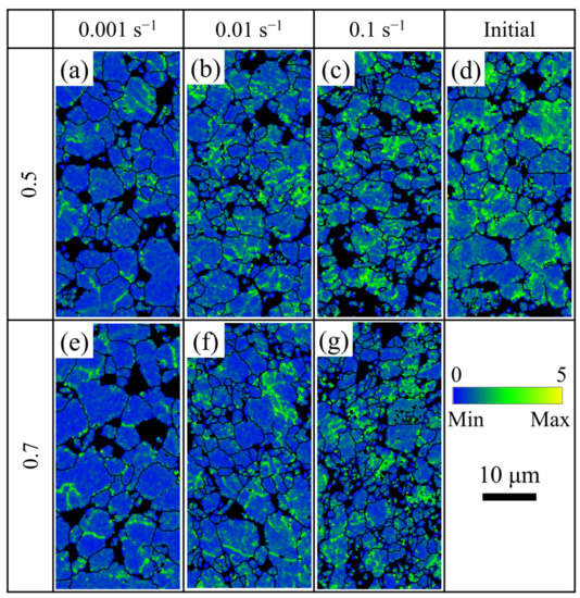 The distributions of KAM at different strains and strain rates when deformed at 950 °C: (a–c) strain 0.5; (d) initial; (e–g) strain 0.7; (a,e) strain rate 0.001 s−1; (b,f) strain rate 0.01 s−1; (c,g) strain rate 0.1 s−1.