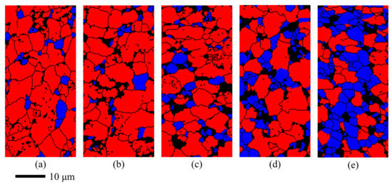 The flow softening coefficient was only 0.12 when the deformation temperature was 950 °C and the strain rate was 0.01 s−1, indicating that the dynamic softening phenomenon caused by recrystallization was very slight [8]. Figure 10 shows the evolution of recrystallization at different strains, where the blue area is the recrystallized grain. It can be seen from Figure 10a that the volume fraction of recrystallization of the as-received sheet was about 8.1%, indicating that the as-received sheet had not been annealed sufficiently. The volume fraction of recrystallization increased to 9.5% after the sample was soaked at 950 °C for 5 min as shown in Figure 10b. It can be concluded that the effect of static recrystallization was limited because of the short holding time [1]. The volume fractions of recrystallization were 12.3%, 22.8%, and 41.7% at the strain of 0.1, 0.5, and 0.9, respectively. The results show that the degree of recrystallization increased rapidly with the increase in strain when the strain rate is 0.01 s−1. Because the strain rate was relatively higher, and the time during the deformation process at 950 °C was relatively shorter, the grain sizes decreased from 2.80 μm at the initial stage to 2.13 μm at the strain of 0.9 gradually. The relationships between the recrystallization fraction, the grain size, and the true strain are shown in Figure 11.