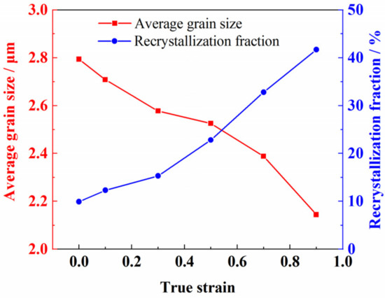 The relationships between the recrystallization fraction, the average grain size, and the true strain when deformed at 950 °C and 0.01 s−1.