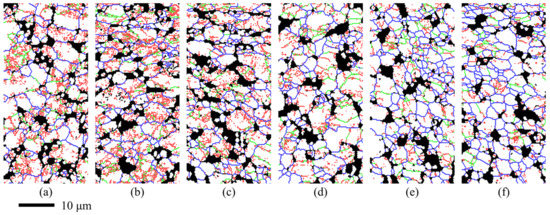 The distributions of the grain boundary at different strains when deformed at 950 °C and 0.01 s−1: (a) Initial; (b) 0.1; (c) 0.3; (d) 0.5; (e) 0.7; (f) 0.9 (red lines represent LAGBs less than 5°, green lines represent MAGBs between 5°~15°, blue lines represent HAGBs more than 15°).