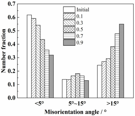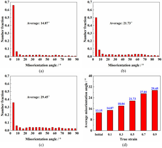 Figure 13 shows the distribution of misorientation at different strains. It can be seen from Figure 13a–c that the proportion of HAGBs was relatively lower and the distribution was uniform, but the proportion of LAGBs was very high [20,28]. The average misorientation increased approximately linearly with the increase in the strain, which was 14.87° and 29.45° at the strain of 0.1 and 0.9, respectively. The increase in the average misorientation was related to the dynamic recrystallization during hot deformation [39].