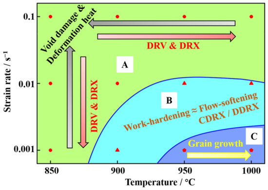 It is well known that the hot deformation parameters have a significant influence on the hot deformation behavior and the evolution of the microstructure [16,17,20]. Qiu et al. [27] pointed out that the flow softening of the SP700 titanium alloy was mainly attributed to DRX during the hot deformation with relatively low temperatures and relatively high strain rates, but the steady-state flow characteristics appeared with the increasing temperature and the decreasing strain rate. During the superplastic deformation of the TC4 titanium alloy, the flow stress increased with the increase in strain during the deformation with a strain rate of 0.0001 s−1 and a temperature ranging from 850 °C to 950 °C [24]. The dynamic hardening rate increased with the increasing deformation temperature due to the more obvious grain growth during the deformation [24]. The deformation behavior and microstructure evolution of the TC31 titanium alloy were similar with the aforementioned SP700 and the TC4 titanium alloy. In the future forming of the TC31 titanium alloy component, one should carefully choose the parameters such as temperature and strain rate to control the forming process and post-form properties according to the relationships between the parameters, the microstructure, and the flow stress. Based on the above analysis, the dynamic softening and hardening behaviors of the TC31 titanium alloy are summarized in Figure 16. In the upper left zone A, with a relatively lower temperature and a higher strain rate, the void damage and the deformation heat generation were the important reasons that caused the dynamic softening of the flow stress with the increase in the strain [37]. The softening effect of DRV and DRX increased with the increasing temperature and decreasing strain rate [18,23,27]. When the deformation temperature was higher than 950 °C and the strain rate was lower than 0.001 s−1, such as in zone C in Figure 16, the dynamic hardening characteristics of the flow stress curves were mainly attributed to the grain growth [11,24]. In zone B, the effect of work hardening caused by dislocation accumulation and grain growth was approximately equal to that of the flow softening caused by DRV, DRX, or void damage [8,28]. In zone B, the recrystallization mechanism was mainly CDRX at the initial deformation stage, and transformed into DDRX with the increase in strain. Based on the above analysis, it is suggested that TC31 titanium alloy components are formed within zone B to obtain a relatively uniform deformation and good post-form properties.