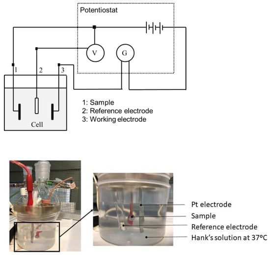Testing sample groups were kept individually immersed in a constant volume of electrolyte for all the measurements. Hank’s solution was selected as an electrolyte in order to simulate the real oral physiological conditions (composition displayed in Table 1). The electrolyte was kept under constant pH (6.7) during the experiments and was completely renewed for each experiment [31,32,33].