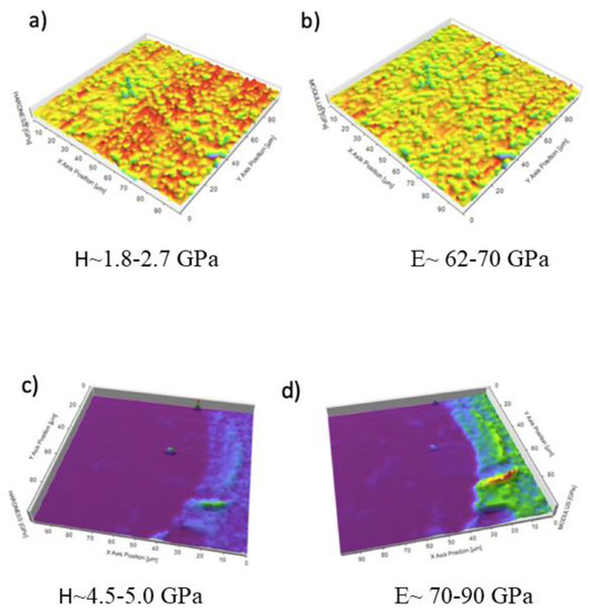 Arrays of 100 indentations (10 × 10) at different loads (1, 2, 3, and 4 mN) were carried out. The hardness and elastic modulus were constant for the entire range of applied loads, as shown in Table 2. The subsequent tests (hardness and modulus of elasticity maps) were carried out at a constant load of 2 mN. At this load, the tip defect (rounding due to the manufacturing process) and the effect of polishing-induced roughness are negligible. Thus, the minimum load that allowed a correlation of mechanical properties and microstructure was selected. No statistically significant differences are obtained in the hardness and elastic modulus.