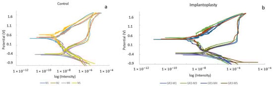 Potentiodynamic curves for (a) control disc (original dental implant material) and (b) implantoplasty samples.
