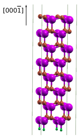 Two models were utilized in the present calculations. Figure 1 presents an exemplary isolated slab having 8 double Ga–N layers, stacked along the hexagonal growth direction and used for the investigation of the carbon adsorption process on the GaN surfaces. The bottom surface of the slab, depending on the termination, was passivated by pseudo-hydrogen atoms of the fractional atomic numbers 0.75e or 1.25e. A 30 Å vacuum layer above the surface separated the slab from its periodic replicas. Three different sizes of the slab’s lateral unit cell were investigated, i.e., , , and , comprising 17, 68, and 153 atoms, respectively. Additionally, for the surface, various coverages of C adsorbates were analyzed, 0.25 monolayer (ML), 0.5 ML, and 1 ML. The positions of all atoms of the slab were relaxed in the geometry optimization step of calculation with the imposed restriction on the forces to be less than 0.02 eV/Å. Figure 2 illustrates four possible types of high-symmetry adsorption sites , on top, bridge, and , presented in a lateral unit cell. Simulations on carbon adsorption were performed using a Grimme correction scheme (DFT-D approach) ([35,36]). In this approach, London dispersion interactions were defined as the attractive part of the van der Waals-type interaction potential between atoms and molecules that were not directly bonded to each other. We applied a dispersion coefficient for the interacting C and N, as well as the C and Ga atoms.