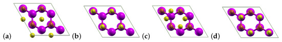 As follows from Equation (2), a positive sign of is related to the energy gain of the system, induced by a substitutional atom present in the topmost GaN substrate’s layer. As follows from Table 4, only the reconstructions evoked by the presence of substitutional atom that holds the relation were energetically favorable. These were in particular the and ones for the N-C and Ga-C diamond–GaN interface types, respectively. The maximum energy gain per one lateral unit cell was eV/cell, and it was observed for the N-C reconstructed interface type, according to the pattern .